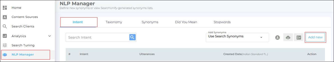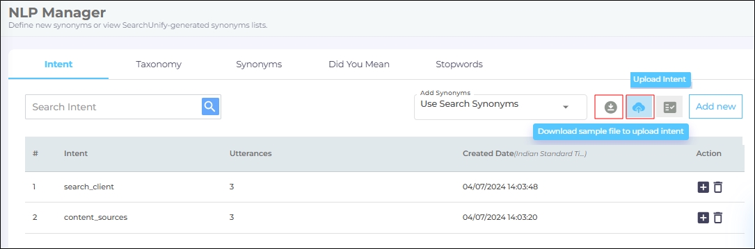 Under the Intent tab in NLP Manager, admins can add new intents and associate utterances with them. Additionally, there is an option to import intents and utterances in bulk.