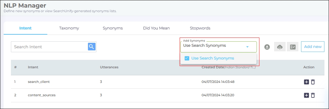 If the utterance "SU" is linked to the intent "Cognitive Search" in NLP Manager, and "SU" has a synonym "SearchUnify" in Search Synonyms, both "SU" and "SearchUnify" will be treated as utterances for the intent "Cognitive Search".