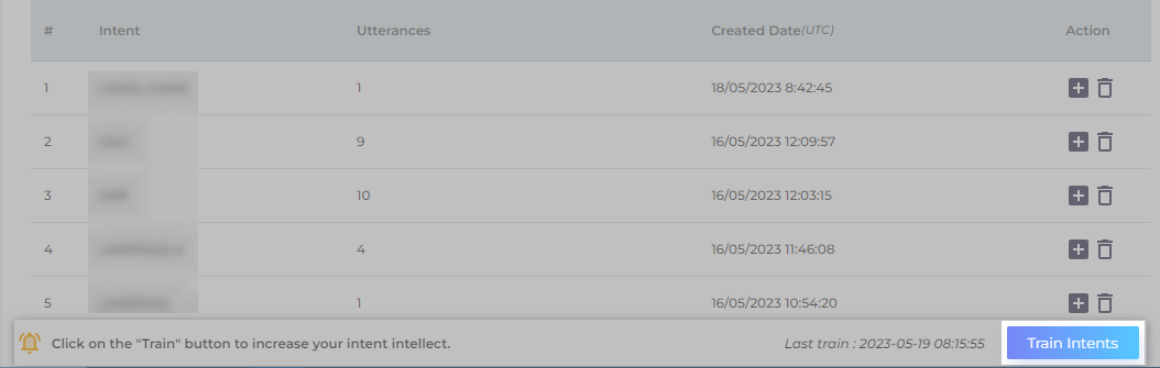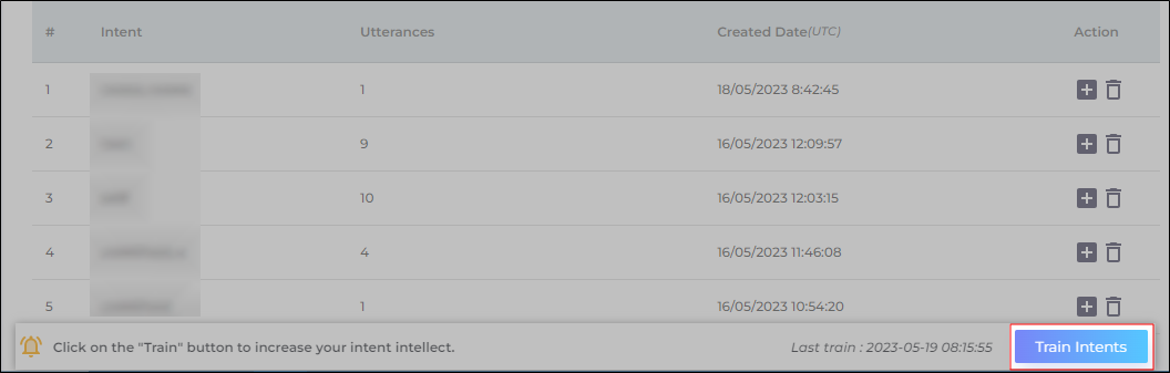 This step is essential. Any additions or updates made to the intents or utterances must be trained to take effect. Click Train Intents to ensure the system processes the latest data.