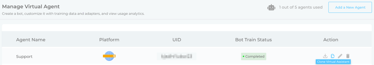 on in Manage Virtual Agent creates a clone which you can install on a new platform. Cloning saves a lot of effort and time when you need identical or similar virtual agents across multiple platforms. Create one and clone many from it.