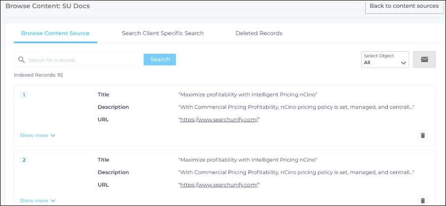 Search Client Specific Search feature enables SearchUnify admins to view and manage indexed records linked to a specific search client. Deleted records are removed only from the associated search client but may reappear after the next crawl.