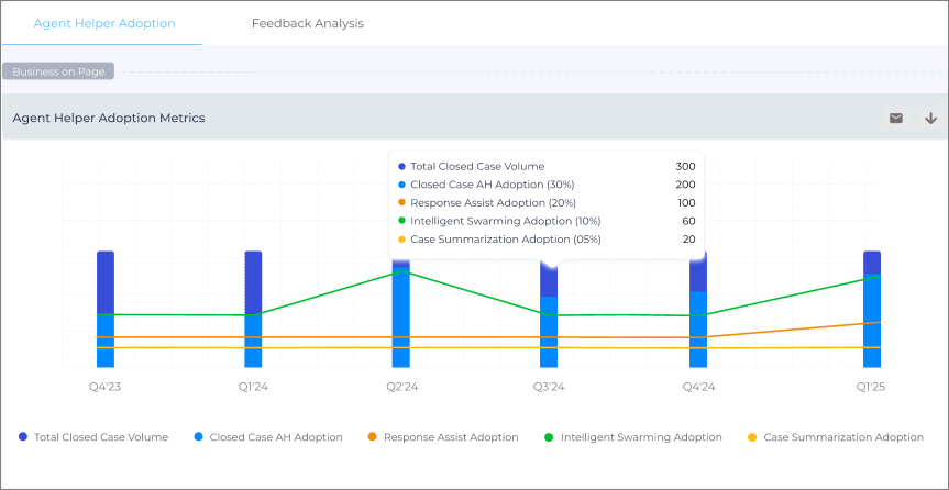 This report Agent Helper Adoption Metrics analyzes data from the last six quarters (presented either as monthly or quarterly), segmented into key metrics: Total Closed Case Volume, Closed Case AH Adoption, Response Assist Adoption, Intelligent Swarming Adoption, and Case Summarization Adoption.