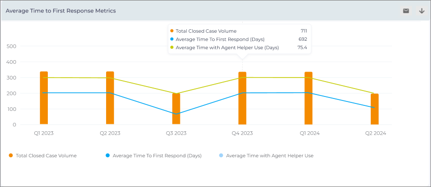 The Average Time to First Response Metrics report analyzes data from the last six quarters, segmented into three key metrics: