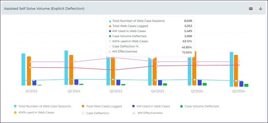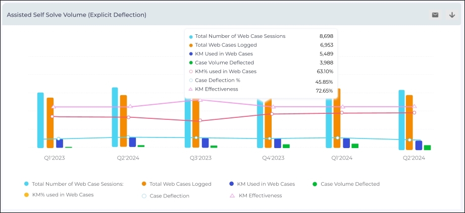 Assisted Self-Solve Volume (Explicit Deflection) – This report offers decision makers the essential metrics, including assisted-solve volumes, case deflection rates, and performance trends for knowledge articles and key insights, such as the Case Volume Deflected and Deflection%, highlight the direct impact of the knowledge in reducing the case volume. This knowledge effectiveness metric clearly measures how well your knowledge base performs in preventing cases.