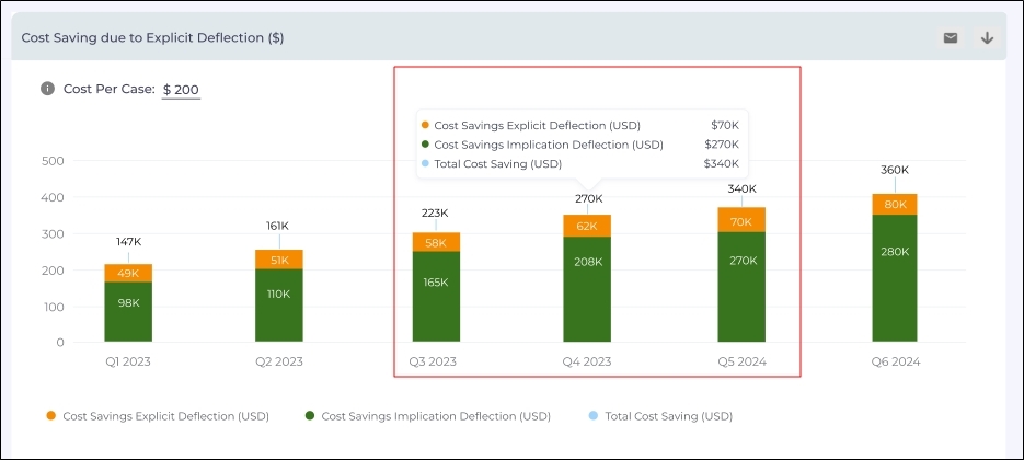 The Cost Savings from Explicit Deflection ($) report provides a comprehensive overview of savings generated through the deflection of customer support interactions through self-service. The calculations are based on the selected search client and rely on the cost per case value provided by a SearchUnify admin, which is entered in the Cost per Case field.