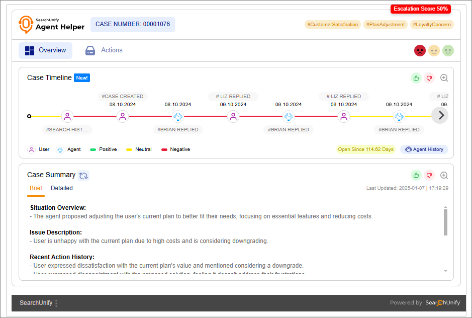 The escalation (probability) score is now visible on each case opened in the Agent helper app. Clicking on the escalation score takes you directly to the Escalation Predictor Dashboard giving insights into the factor contributing to the escalation score.