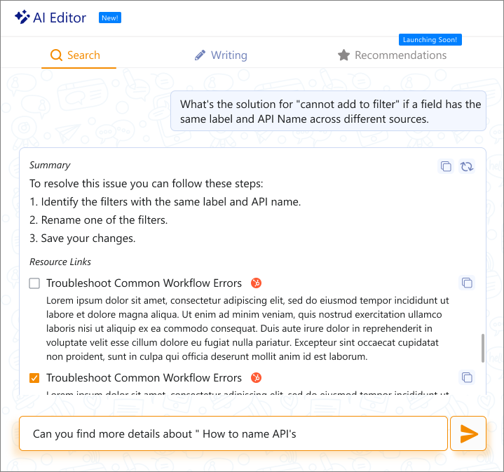Writing – Enables support agents to generate, edit, and refine responses with ease. Irrespective of what the agents are crafting-concise summaries, detailed explanations, or structured bullet points-they can tailor replies to precisely match customer needs.