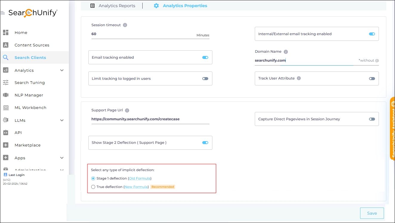 The formula for calculating stage one deflection is also updated. The new formula is known as True Deflection. You can activate True Deflection from Search Clients > Edit > Analytics Settings.