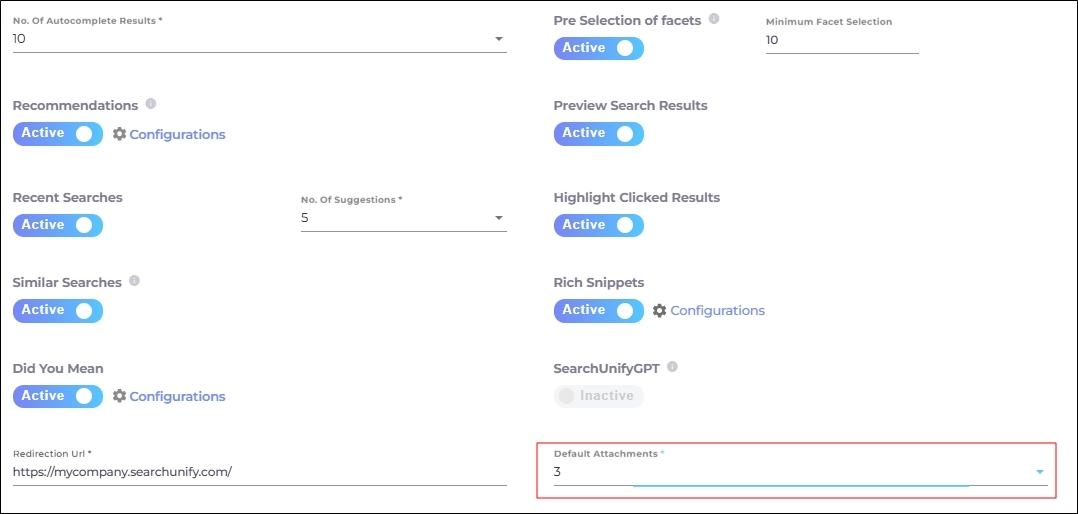 In the Default Attachments dropdown, SearchUnify admins select the maximum of attachments visible on the search clients page. By default, this limit is set to three.