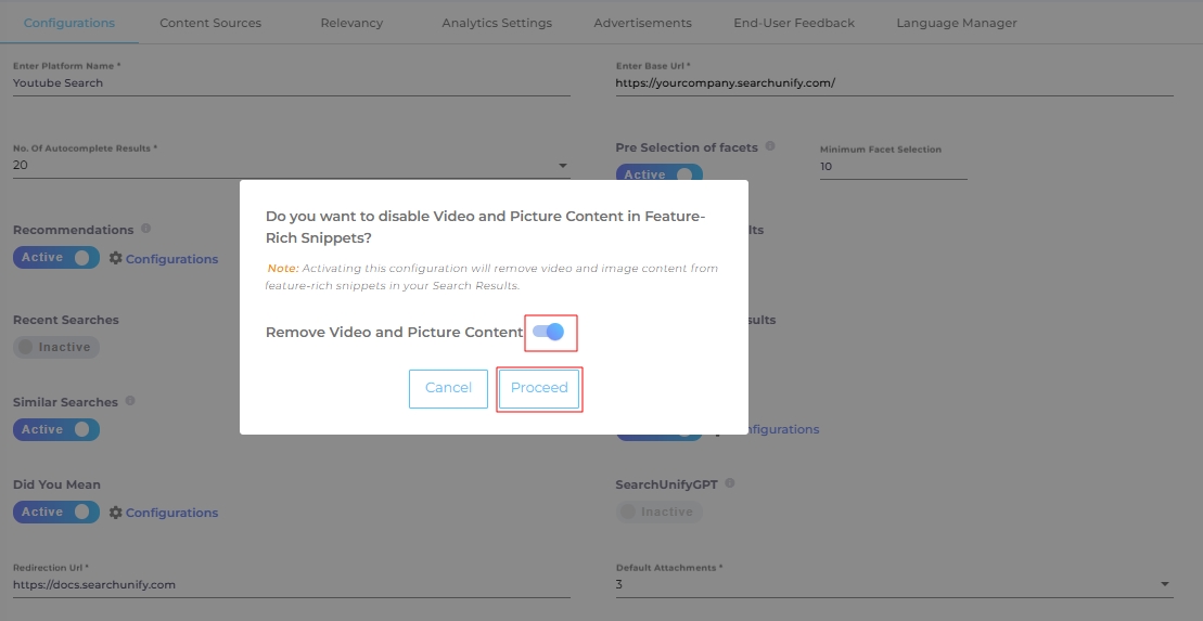 A new configuration in Search Clients > Edit > Configurations > Rich Snippets, allows the admins to keep the Rich Snippets text-only or display videos and images in the rich snippets. The multimedia content is displayed by default. The admins can check Remove Video and Picture content to hide it.