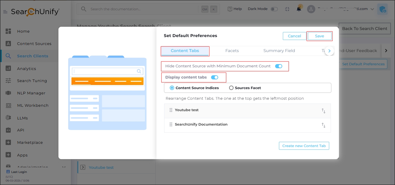 Admins can now check Hide Content Source with Minimum Document Count in Search Clients > Edit > Content Sources > Set Default Preferences > Content Tabs to hide the content tabs from the search results page when there are no results from the content tabs.