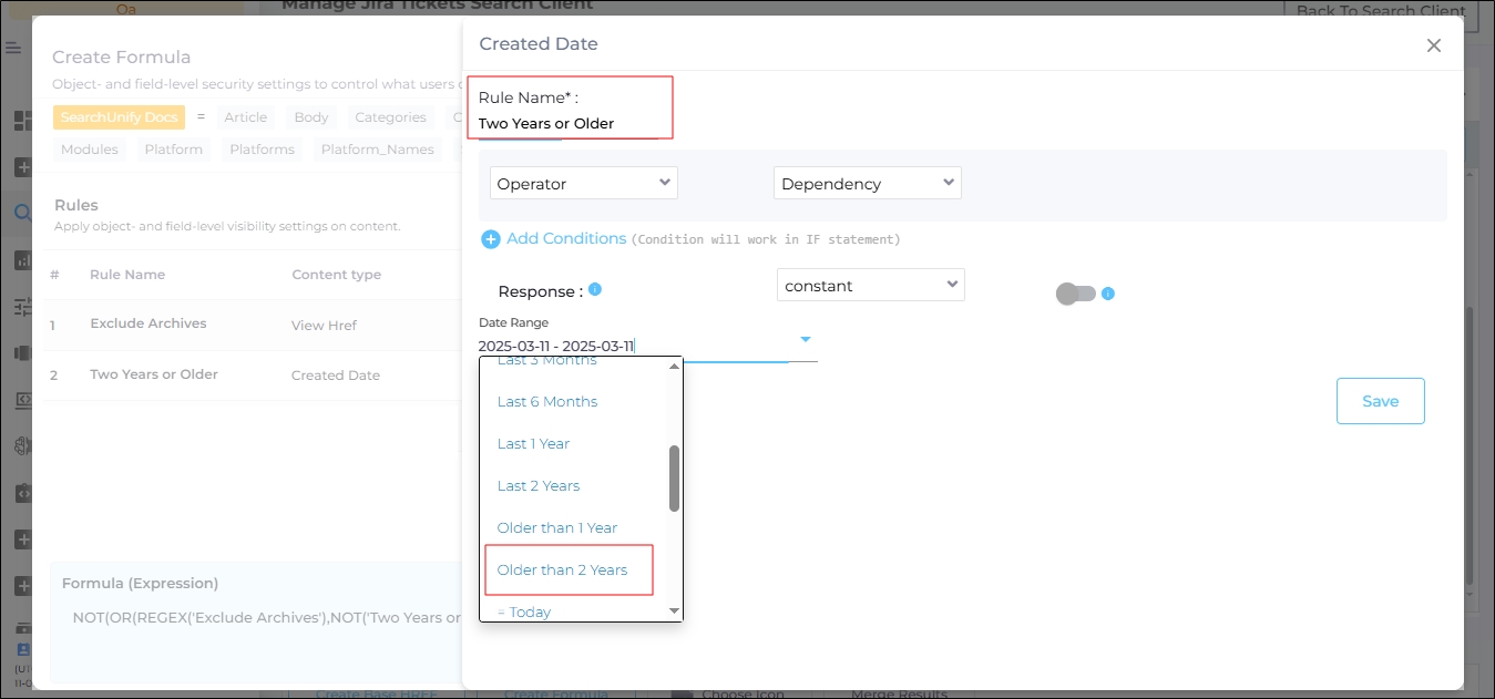 Create Formula. The date range on fields containing timestamps has been expanded. The newly-added date ranges in Create Formula are: Last 1 Year, Last 2 Years, Older than 1 Year, and Older than 2 Years.