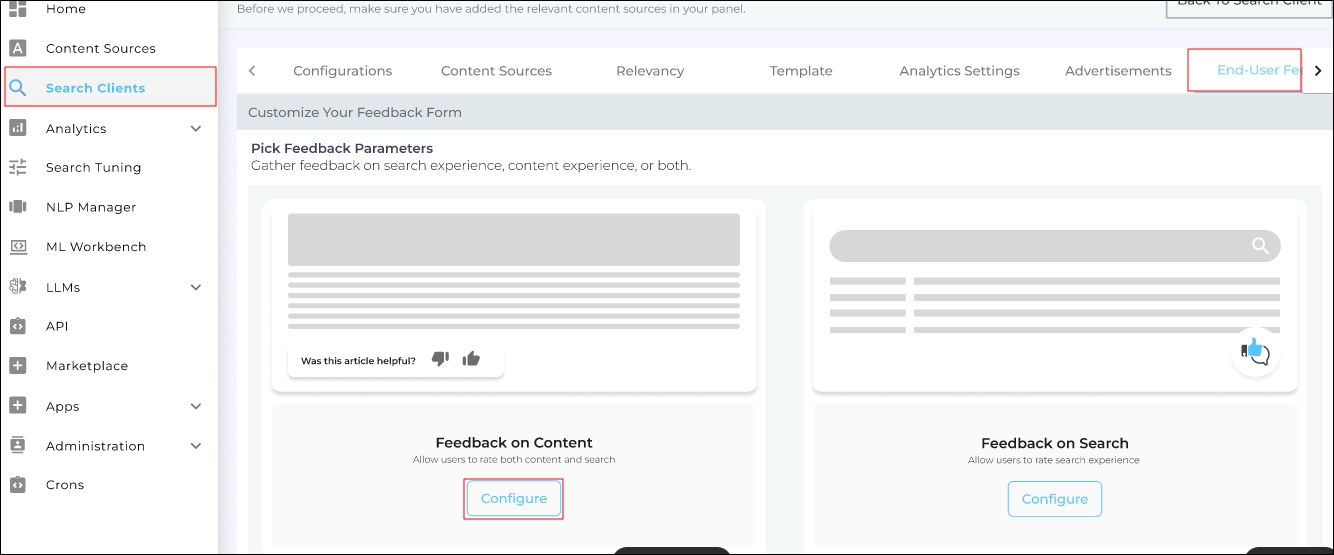 The End-User Feedback tab is revamped to improve stage one case deflection calculation. The admins can now see two tiles in Search Clients > Edit > End User Feedback: