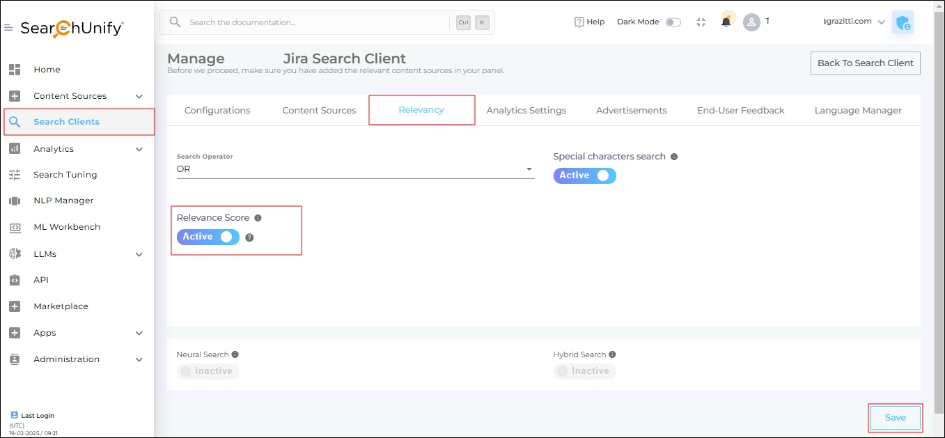 Fig. The Search Relevancy Score toggle in the Relevancy tab.