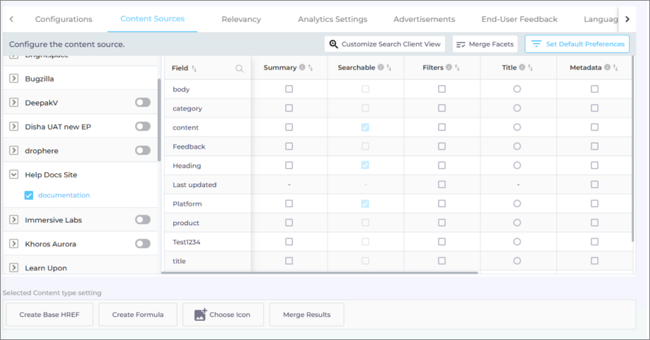 Hybrid Search is turned off by default. To turn it on, write to your CSM. Before turning on Hybrid Search, ensure that all the required fields are checked in the Searchable column. When Hybrid Search is turned on, users cannot add or remove searchable fields. The entire column is disabled.