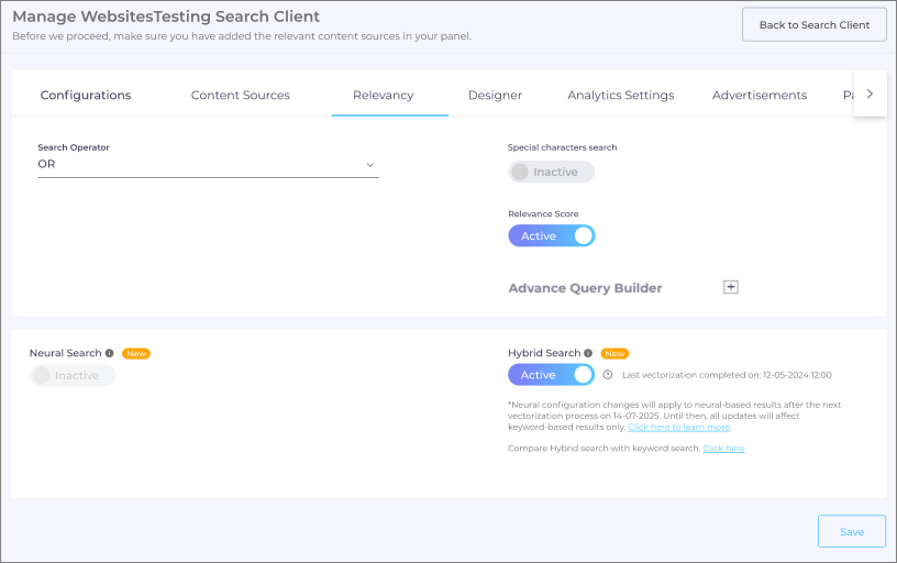 Searchable fields cannot be edited or removed from any content source linked with the search client where Hybrid Search is on.