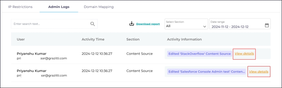 Admin Logs now capture only changes made under the Content Sources tab, eliminating unrelated user activity to provide cleaner, more relevant records.