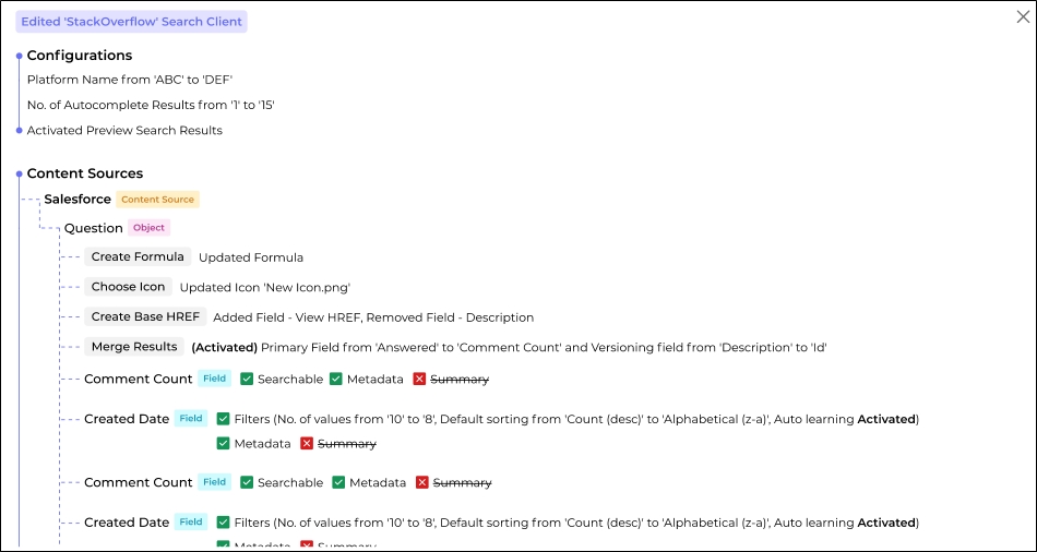 Users can now click View Details to see changes, organized by tabs such as Authentication, Configuration, Frequency, Rules, Content Annotation, and Crawling Cases.