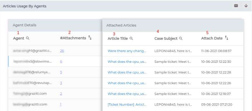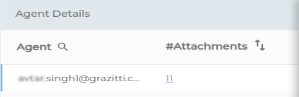 The email of the support rep who has linked at least one article to a case is recorded in the leftmost column, Agent. A search box allows you to find an agent by their email. Right next is the #Attachments column which tells a SearchUnify admin the number of articles shared by an agent. The column is sortable, allowing you to find the agents who share the most and the least articles. In the image you can see that ****.singh1@grazitti.com has shared 11 articles.