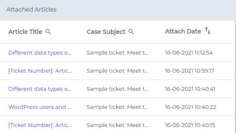Clicking the number in Attachments open an Attached Articles section where you can find the shared articles in Article Title, the cases to which articles have been linked in Case Subject, and the time of sharing in Attach Date. Each column is sortable so you can look up a case to find the articles attached to it or an article to find the cases to which it has been linked.