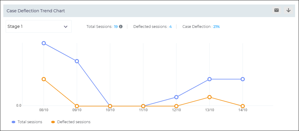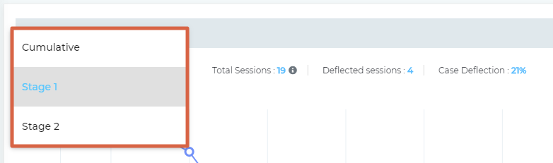 Deflected Sessions. The number of sessions in which a case deflection took place during a given time which depends on the selected Date Range. Users can use the dropdown in top left to view the graph to view: