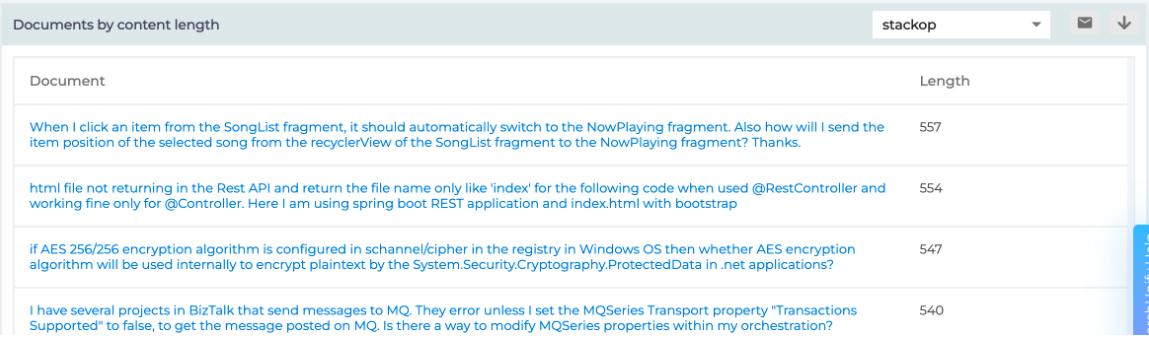 The report has its own dropdown in the gray ribbon which displays a list of content sources linked with the search client picked from Select Search Client. In the default state, the report shows the longest documents from across content sources. But you can use the dropdown to find the longest documents from a specified content source. In the next image, all the documents are from content source "stacktop."