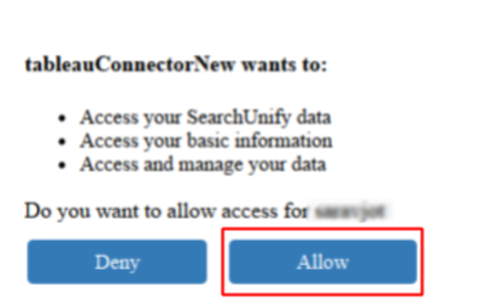 - The tableauConnector will request permission to access your data in SearchUnify. Select Allow.