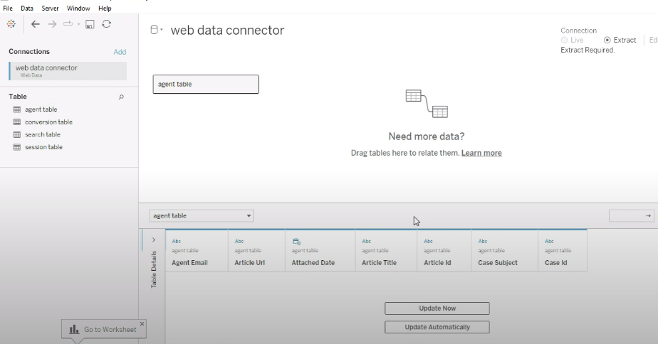 Irrespective of the data entered, Tableau only imports four tables: agent, conversion, search, and session.
