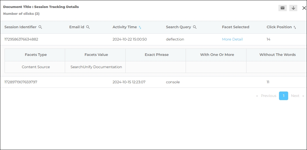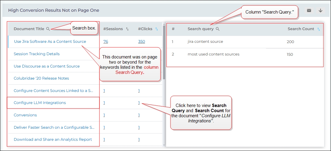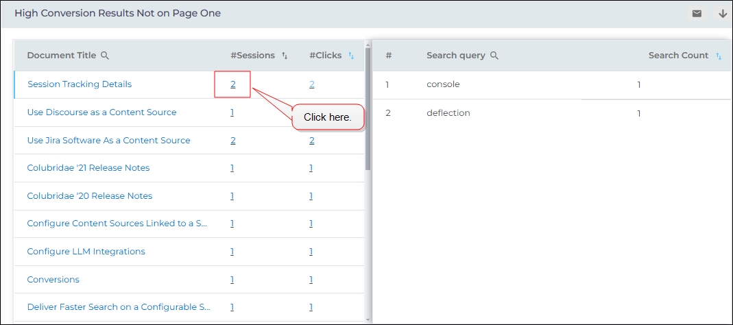Search Query contains the keywords that led to a click and Search Count displays the number of times each search was performed. To view the search queries and search clients for a Document Title, click the numbers in the Clicks column.