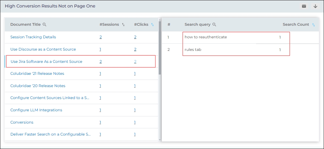 The column Document Title contains the titles of the documents clicked on rank 11 or higher. The search queries which led to the click are listed in the right-half of the report, where two columns are displayed: Search Query and Search Count.