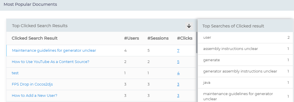 Top Searches of Clicked Results maps clicked articles with keywords. The article in the first row "Maintenance guidelines for generator unclear" has been clicked 7 times. Two clicks happened when an end-user searched user. The remaining 5 clicks can be attributed to these five queries, assembly instructions unclear, generate, generator assembly instructions, java, and maintenance guidelines for generator unclear.