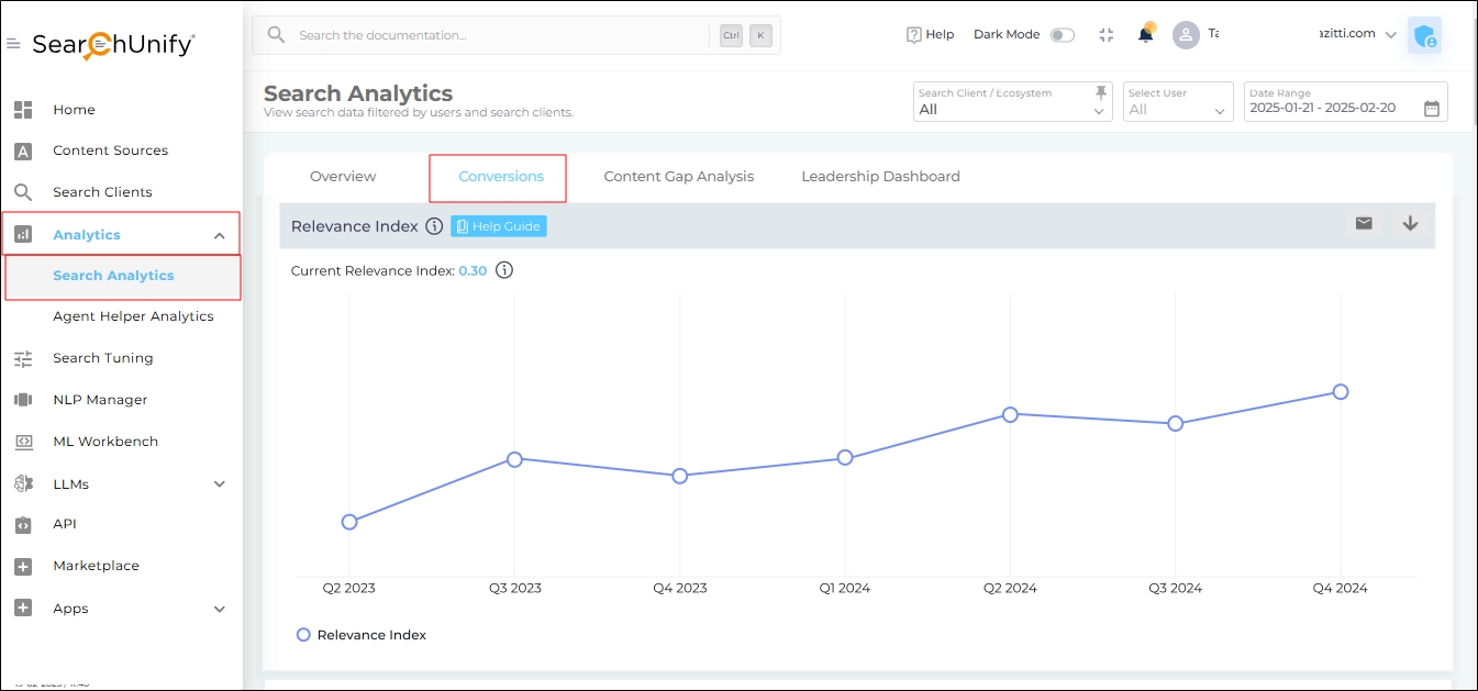 Fig. The Relevancy Index Report in Search Analytics Conversions.