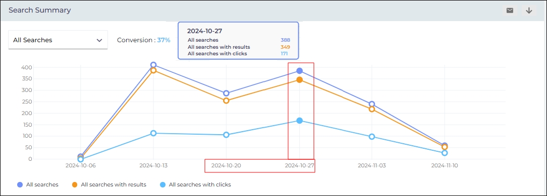 The graph illustrates trends in the searches made in the last five-week period (default) or the period selected in Date Range. It captures six metrics: