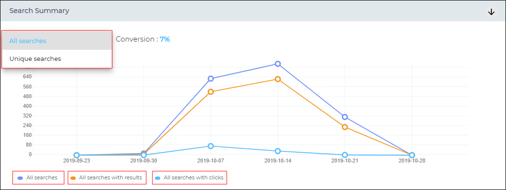 The Search Conversion Rate or Click-Through Rate is the ratio of the number of conversions to the number of either All Searches or Unique Searches.