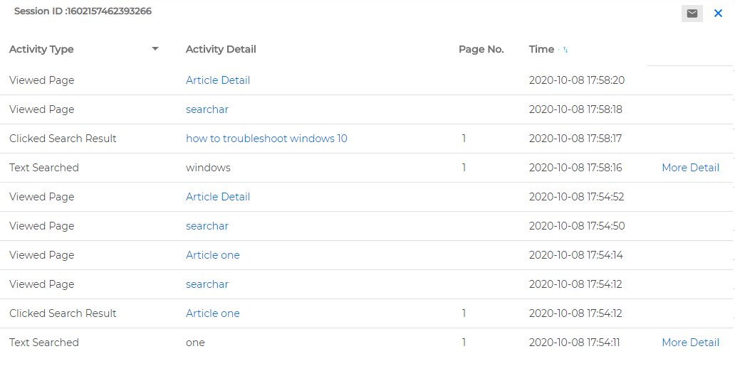 Click the ID to open a dialog that lists all the tracking activities in Activity Type, a summary of those activities in Activity Detail. This column also contains case subjects after a vertical bar (|) when a case is created.