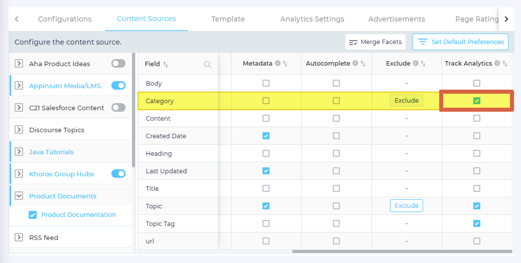 To set up Content Facets, go to Search Clients > Edit > Content Sources. Then, in the Track Analytics column, check the content fields for which data is to be tracked. For illustration, the Category field has been checked.