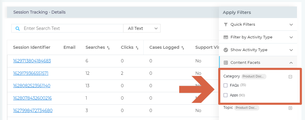 The number of sessions on a popular search client can quickly run into thousands. To make an admin console user’s job easier, SearchUnify provides two navigation tools: Search Box and Apply Filters.