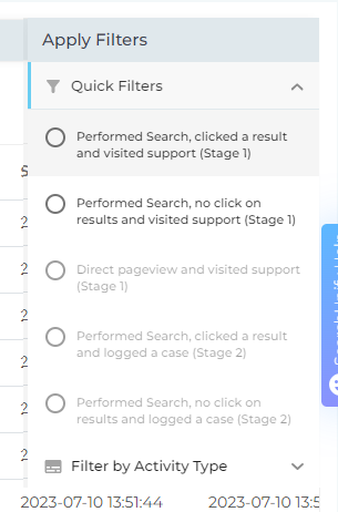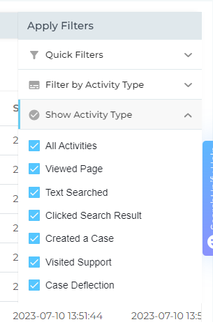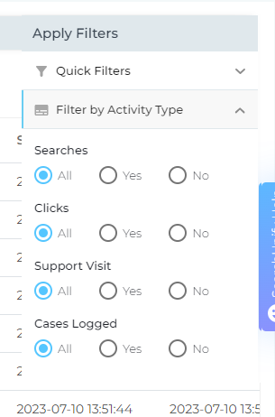 The fields in Activity Type can be controlled from All Activities (filter). For searches, details include the query. For clicks, the URL of the clicked page. And for cases, the case subject.