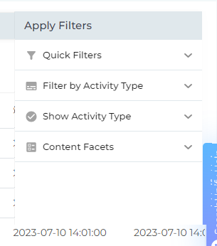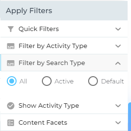 Four filters to configure a report are available: Apply Filters, Quick Filters, Filter By Activity Type, Show Activity Type, and Content Facets.
