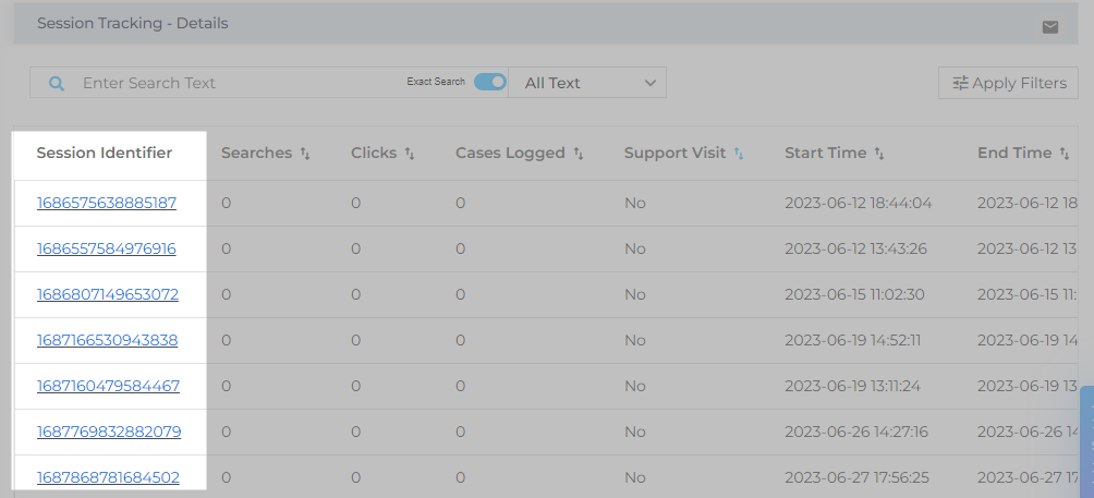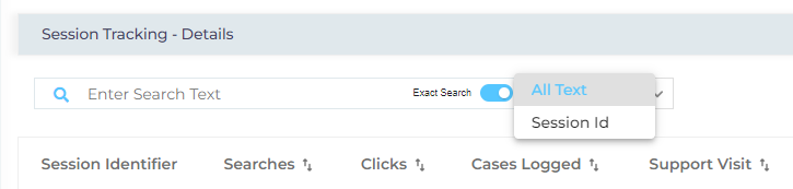 - All Text. The default option. It is to be used when you have a query and are interested in finding out the users or the sessions who have looked up that query. To use, write your query in the search box and hit Enter. The report pulls up sessions in which the query is looked up. Exact Match is turned on by default in All Text search. To deactivate, simply uncheck it. Deactivation is valid for a session. The next time you log in, you will find a turned on Exact Match again. Checking and unchecking Exact Match changes search results immediately.
