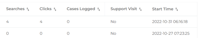 The last five activity columns (Searches, Clicks, Cases Logged, Support Visit, Start Time, and End Time) are sortable. The rows can be rearranged by the number of searches; both in their increasing and decreasing order.