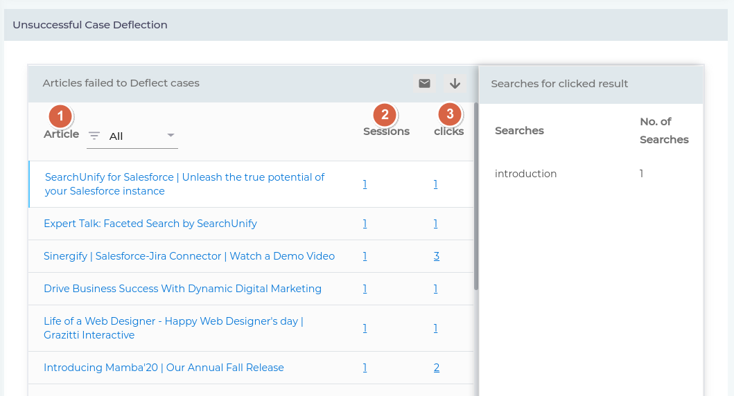 The section on the left (Articles Failed to Deflect Cases) tracks the consulted articles (1), the sessions in which they were consulted (2), and how many clicks each article received (3).