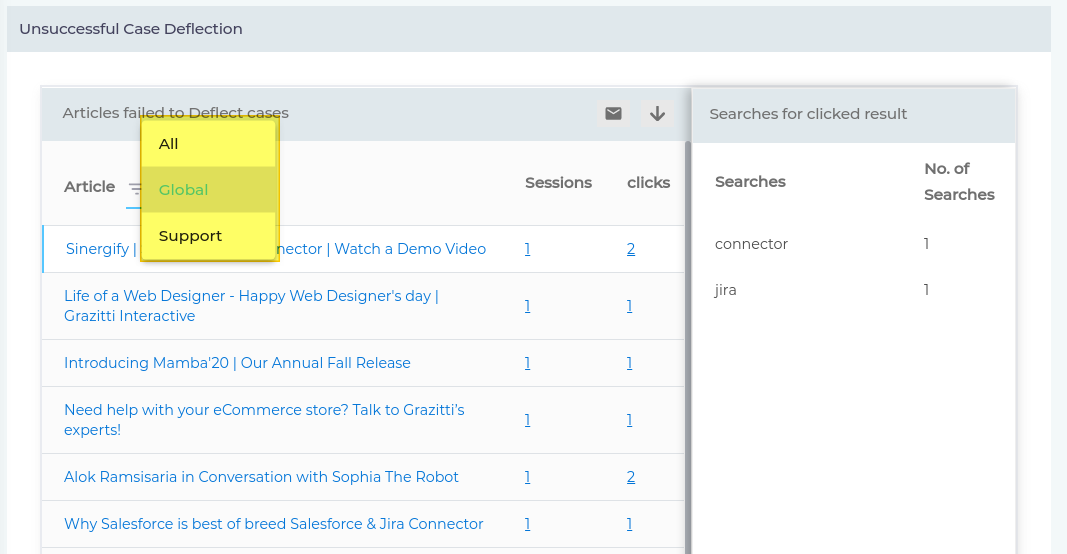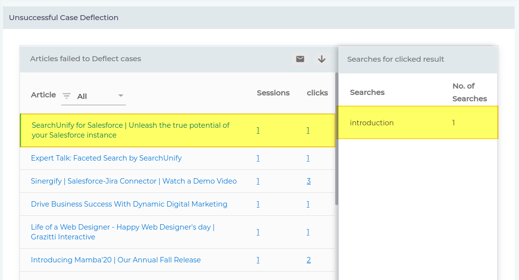 Also, clicking a row in the left section (Articles Failed to Deflect Cases) changes the information in the right section (Searches for Clicked Result), where the Searches column lists the queries that led a user to the clicked article and No. of Searches captures how many times the query was run.