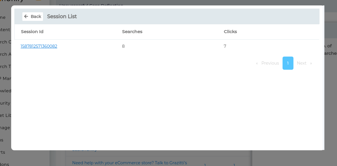 Clicking a number in the Sessions column opens a dialog listing the sessions in which the article was searched. Each row captures three metrics: Session ID, total searches in the session (Searches), and total clicks in the session (Clicks).