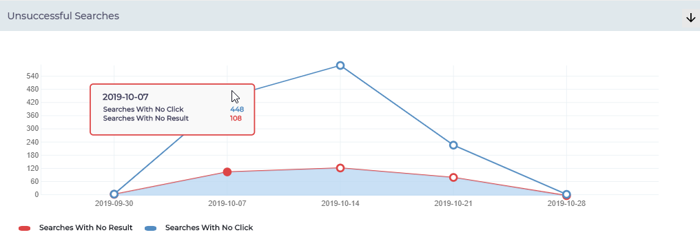 The graph illustrates trends in searches made in the selected period with number of searches with no results and searches with no clicks. This report helps Admins to perform gap analysis and track the keywords which didn’t generate any search result on weekly basis.