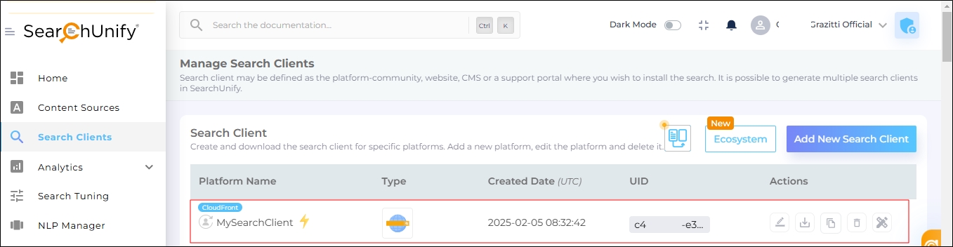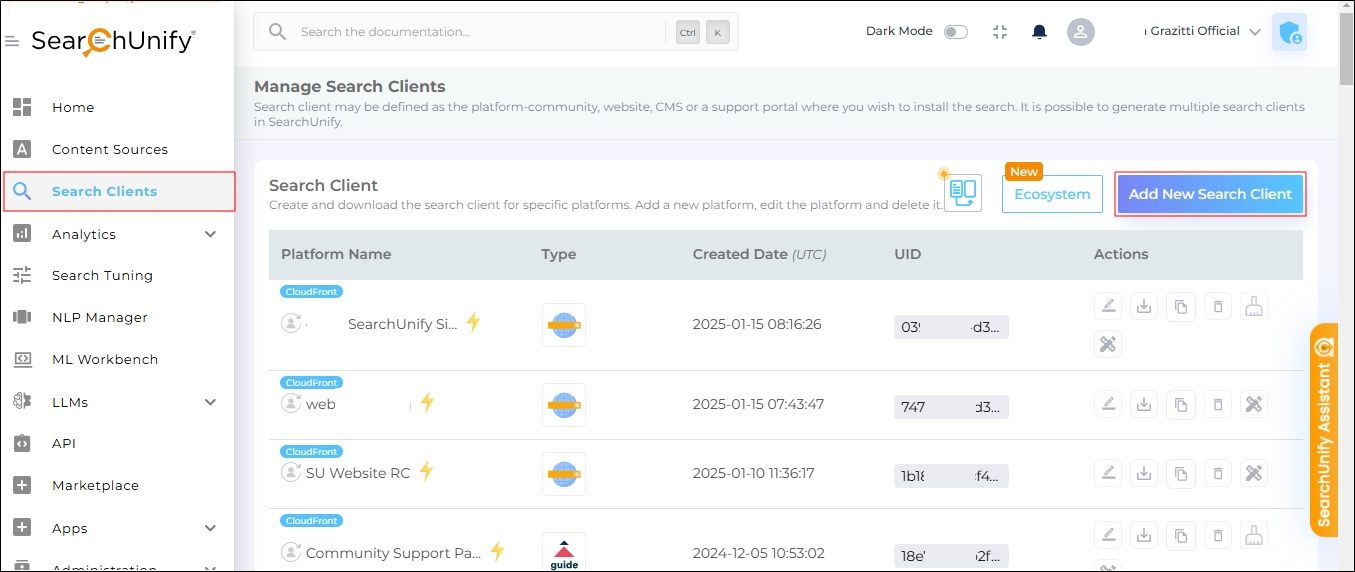 SearchUnify provides powerful search clients to help users find information, such as cases, community threads, and the data inside their organizations. The search clients come in several flavors, each calibrated to work on a platform. However, before a search client can be set up on a platform, it needs to be added to your instance and configured. This article demonstrates the steps to add a search client to your instance. For configuration, visit the Edit Search Client Configurations section.