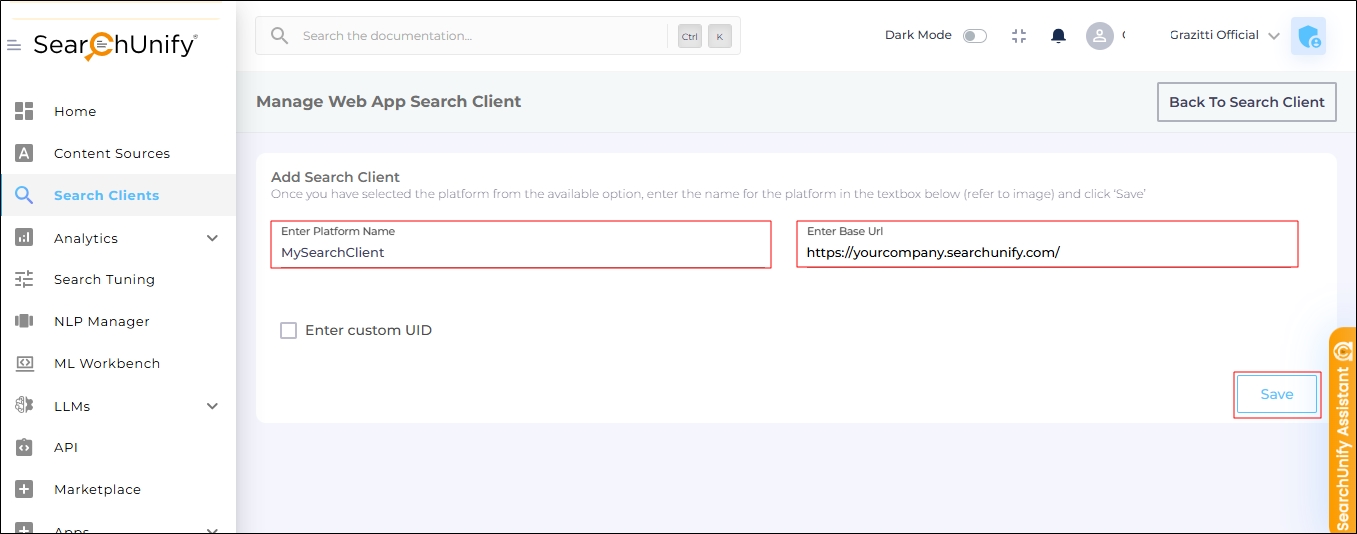 Give your search client a name in Enter Platform Name, write your SearchUnify instance URL in Enter Base URL, and click Save.