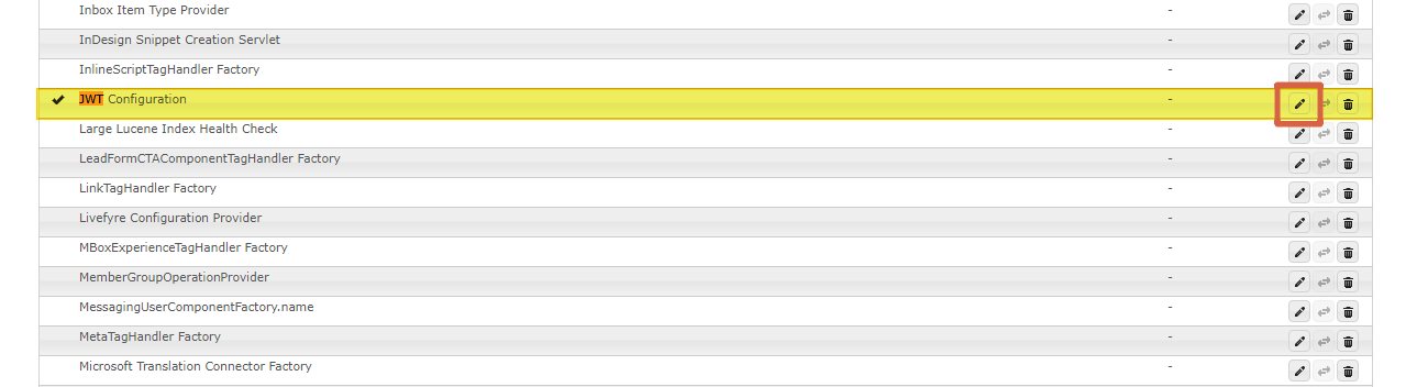 /system/consoleto the Base URL of your AEM instance. For example, if the Base URL isaemdemo.grazitti.com, then the configuration page would beaemdemo.grazitti.com/system/console. - Search JWT Configuration and open it for editing.