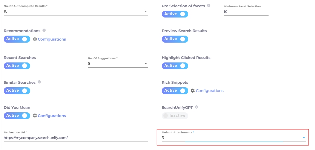 In the Default Attachments dropdown, SearchUnify admins select the maximum of attachments visible on the search clients page. By default, this limit is set to three. Other available values are: