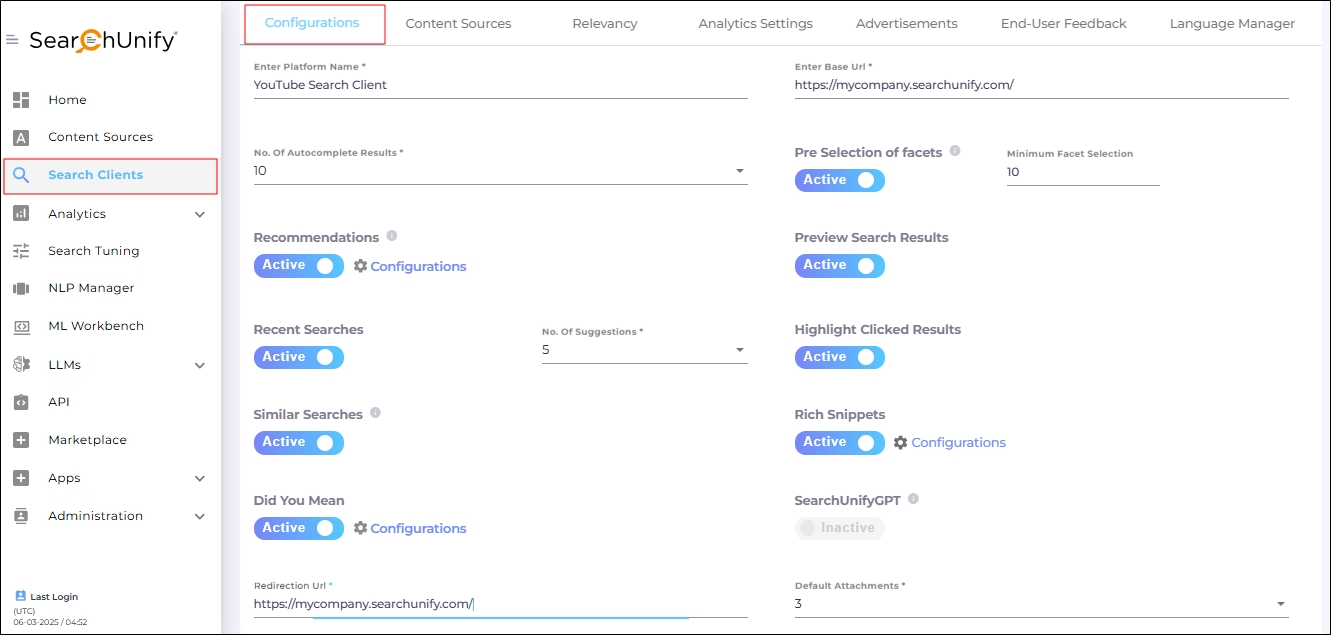 Fig. A snapshot of the Configurations tab in Search Clients.